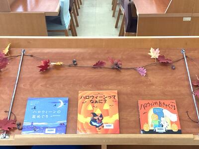桐商図書館でも、栞のプレゼント等をしています。また、期間限定でハロウィンコーナーを設けています。手に取りやすい絵本を並べてあります。ぜひ、ご覧ください。