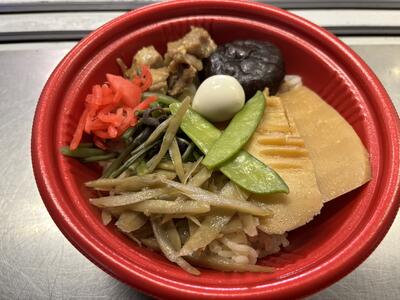 健康的ですよね。五目ご飯は、めんつゆのようなダシ感が感じられるご飯です。