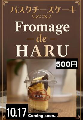 課題研究のプロモーション活動で連携させていただいているfromage de HARU(フロマージュ・ドゥ・ハル)様のバスクチーズケーキを、10月17日(金)に桐商の一階ピロティで販売します。価格は一個500円です。濃厚なのに食べやすく、しかもグルテンフリーなので小麦アレルギーの方でも召し上がれるバスクチーズケーキです!ご満足いただけると思います。販売数量は限定30個!みなさん、買いに来てください!